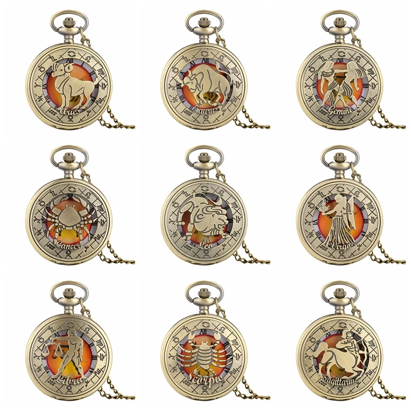 Name: Reloj de bolsillo con diseño Retro del zodiaco para hombre y mujer, cadena de collar moderno, colgante de 12 Constelaciones de cobre, regalo de cumpleaños